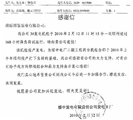 日前,綏中發(fā)電有限責(zé)任公司發(fā)電B廠(chǎng)發(fā)來(lái)感謝信,通報(bào)了我公司供貨的2000VZNM型立式循環(huán)水泵順利通過(guò)168小時(shí)滿(mǎn)負(fù)荷試運(yùn)行, 順利發(fā)電。綏中發(fā)電有限責(zé)任公司發(fā)電B廠(chǎng),為2X1000MW超