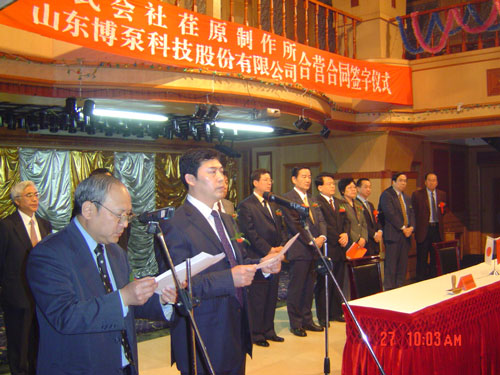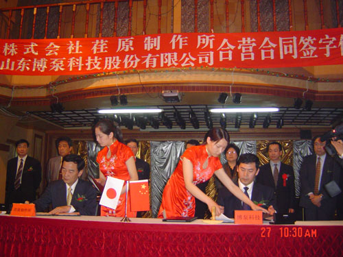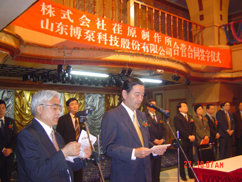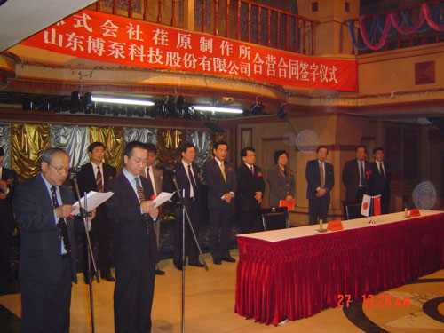 新聞中心 2005年4月27日,在博山萬杰國際大酒店山東博泵科技股份有限公司與日本株式會社荏原制作所正式簽署了注冊資本1100萬美元的合營公司――荏原博泵有限責任公司。該公司的建立將通過引進世界最大的泵企業(yè)――日本株式會社荏原制作所的先進技術,加快大型泵、高壓泵國產化進程,建成具有國際競爭力的一流企業(yè)。為中國水電、核電及超臨界火電項目,為南水北調等大型水力工程提供高質量、高技術含量的一流泵產品,提升中國機械工業(yè)技術、質量水平,促進產品更新換代,為中國電力、冶金、水力事業(yè)的發(fā)展乃至中國國民經濟的發(fā)展做出應有的貢獻。