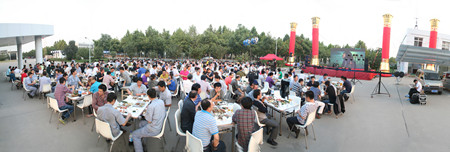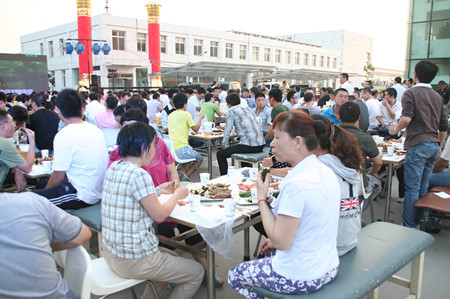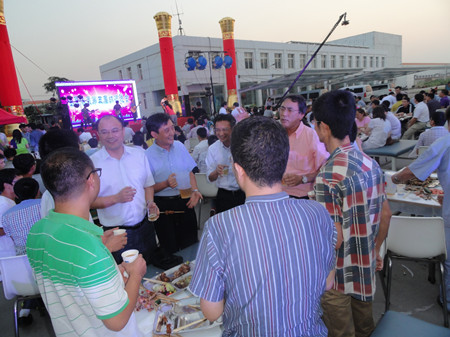 下午5點,在夕陽的映照中,公司辦公樓前,忙碌的員工穿梭在會場,辦公樓南面已搭建好舞臺,碩大的LED屏矗立在舞臺上。舞臺兩側(cè)各豎立著兩個團結柱。舞臺前的空地上,已擺放好63張桌子,每張桌子配放6把椅子。桌子上,豐盛的飯菜已放好,靠西邊的草坪旁,是備好的新鮮的青島扎啤。