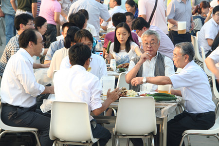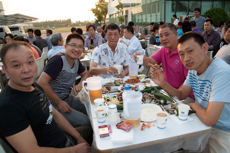 17:30,志賀進總經(jīng)理端著酒杯,走到舞臺前,首先感謝廣大員工的辛勤努力,使公司取得很好的業(yè)績,隨著一聲“干杯”,荏原博泵第五屆納涼晚會拉開了序幕。公司380多名員工,分部門有序而坐,大家推杯換盞,興高采烈。公司領導挨桌給員工們敬酒,大家沒有了上下級的拘謹,一派歡樂祥和的景象。